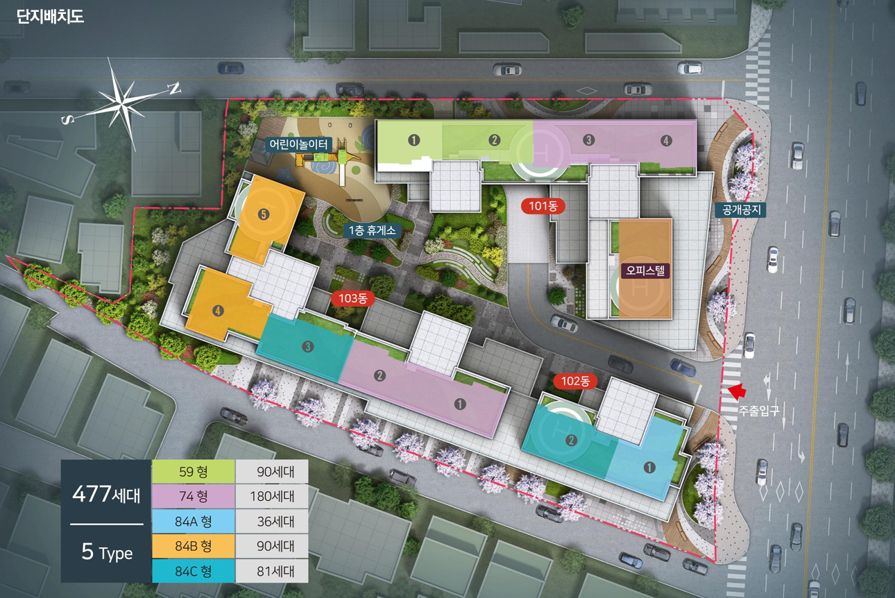 - 세대수: 아파트 477세대(전용 59~84㎡), 오피스텔 104실 → 총 581세대 대단지